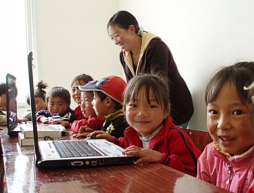 The children and notebook computers in the elementary school of Long Terrace Valley