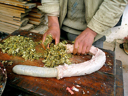 The sausage which made by chopped meat and much spicy grass is a favorite.